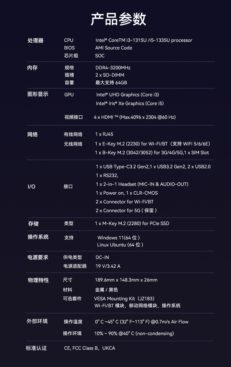 CA88(中国区)有限公司科技D613采用英特尔Raptor Lake酷睿i3-1315U/i5-1335U 处理器,作为一款性能强悍的主机,它的TDP仅15W,能有效降低能耗,延长电池寿命。在内存方面,D613采用2 x SO-DIMM DDR4-3200 MHz,最大可达64GB,并配备1 x M-Key M.2 (2280) for PCIe SSD。
