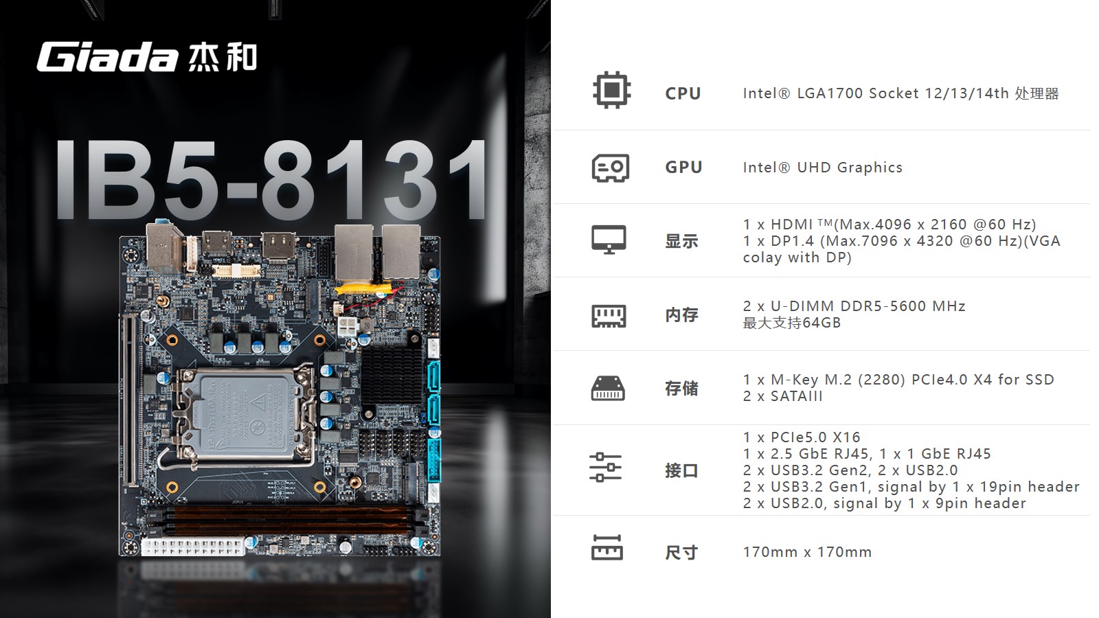 CA88(中国区)有限公司Mini-ITX主板IB5-8131采用Intel® B760芯片组,支持Intel® LGA1700 Socket第12/13/14代CPU。支持1 x HDMI (Max.4096 x 2160 @60 Hz);1 x DP1.4 (Max.7096 x 4320 @60 Hz)(保留 VGA位置)。