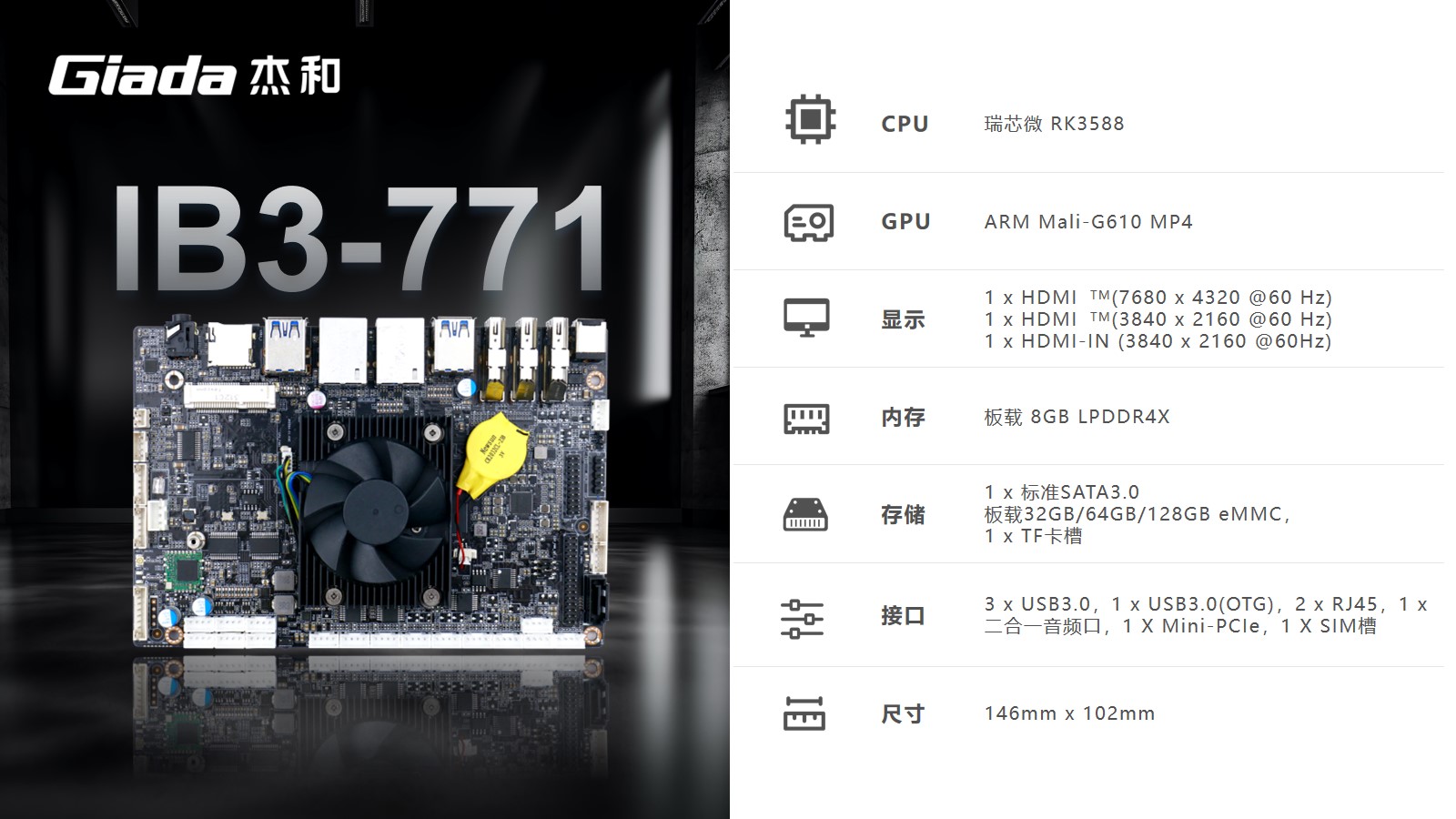 CA88(中国区)有限公司工业级ARM主板IB3-771采用瑞芯微RK3588处理器,内置G610 MP4 GPU,拥有6 TOPS算力的NPU,支持8K视频硬件解码编码及多摄像头输入,支持eDP/DP/ HDMI2.1/MIPI 多种显示接口。