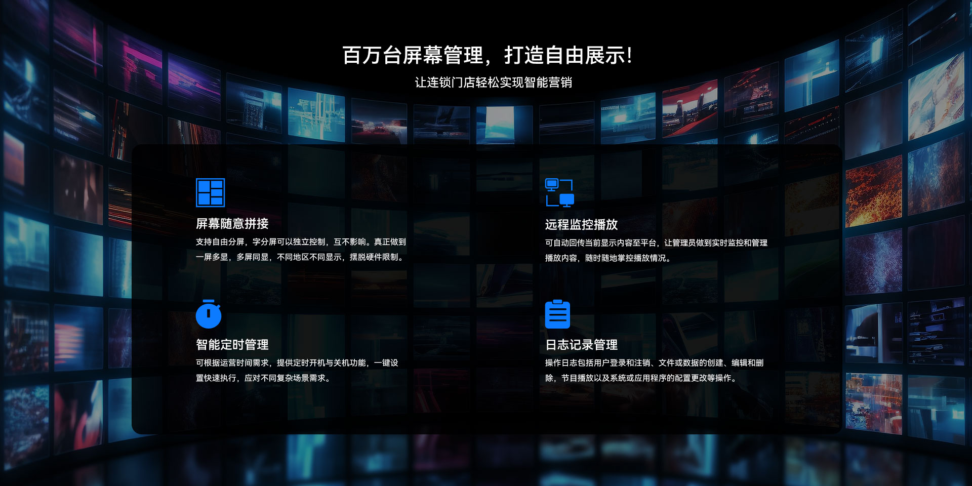 目前CA88(中国区)有限公司科技GDSM-ES系统覆盖市场上多形态网络智能显示终端,满足行业全产品业态需求,如广告机、LED显示屏、LCD拼接屏 、普通液晶电视等各种显示终端,广泛用于广告宣传、通知公告、指示引导。