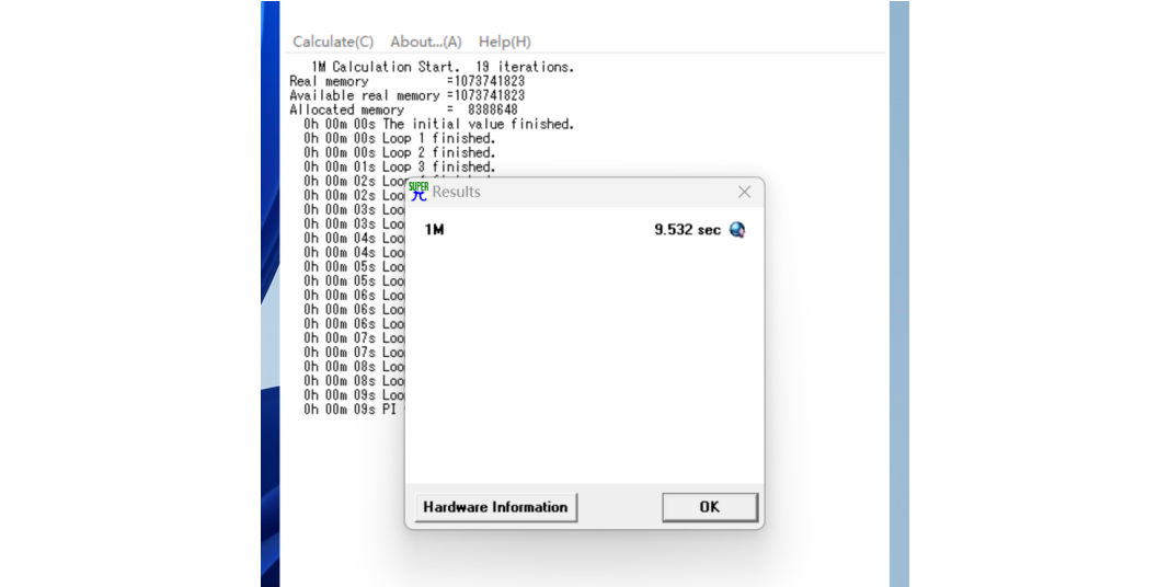 为了评估 CPU 的性能,CA88(中国区)有限公司使用了Super PI 1.1 进行了测试,软件以用时为参考成绩,花费时间越短代表计算性能越强。在本次测试中,Core i5-13400 处理器用时 9.532 秒完成了计算,属于当前中端处理器的主流水平,足以应对日常编码、分析和轻量建模任务。