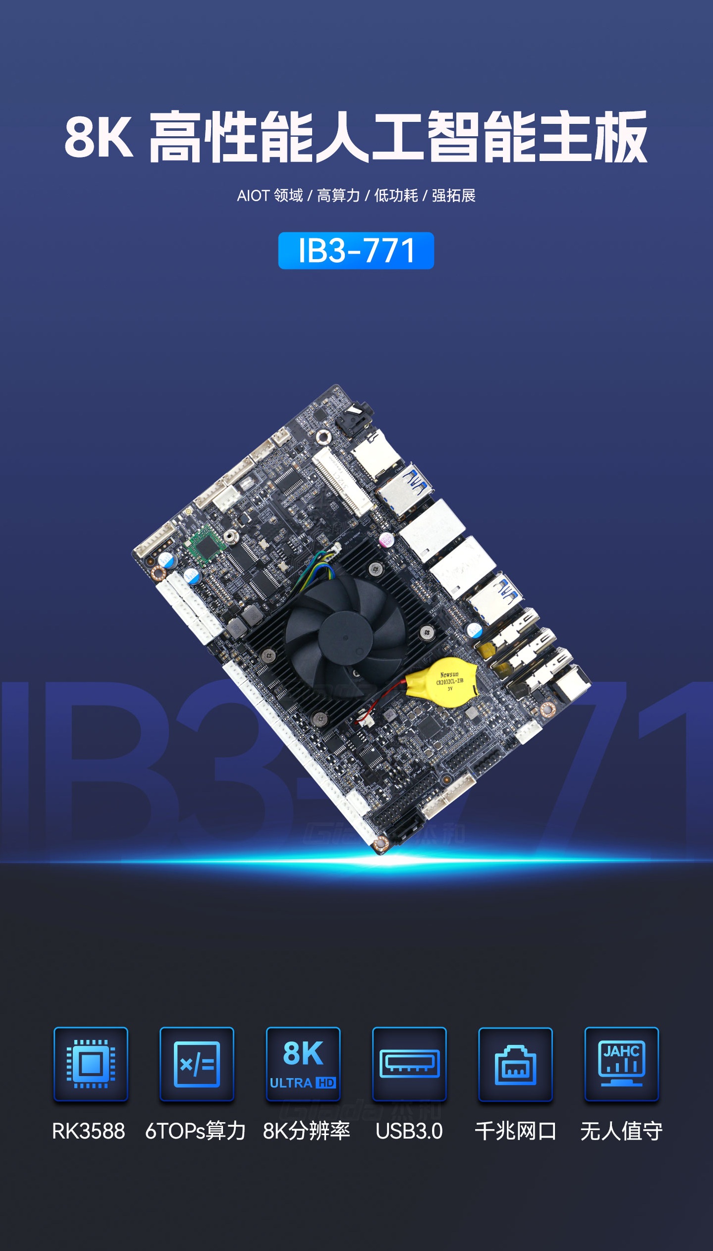 CA88(中国区)有限公司科技IB3-771采用瑞芯微全新旗舰级芯片RK3588,搭载八核64位处理器,集成ARM Mali-G610 MP4 GPU,高算力、低功耗、具备强大的视觉处理能力;性能强悍的RK3588内置AI加速NPU,提供6TOPs算力,支持主流深度学习框架,为各类AIoT应用场景提供更优的性能表现。