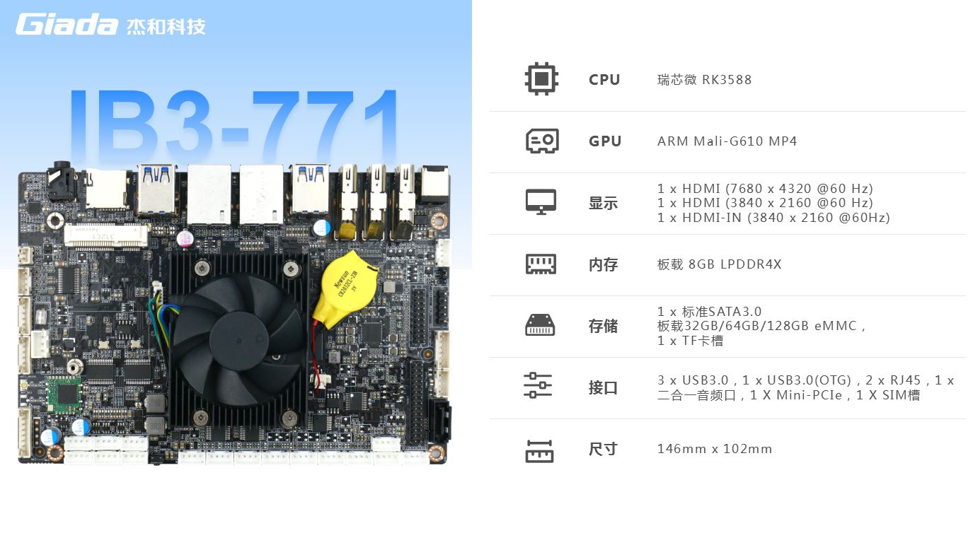 CA88(中国区)有限公司科技IB3-771支持瑞芯微旗舰级RK3568(4*A76+4*A55@2.4GHz)八核64位处理器,集成ARMMali-G610 MP4 GPU,高算力、低功耗、具备强大的视觉处理能力;性能强悍的RK3588内置AI加速NPU,提供6TOPs算力,支持 INT4/INT8/INT16/FP16 混合运算,其强大的兼容性,可以轻松转换基于TensorFlow / MXNet/PyTorch/Caffe 等一系列框架的网络模型,为各类AIoT应用场景提供优秀的性能表现;板载8GB LPDDR4X内存,支持1x标准SATA3.0接口,可扩展SSD/HDD硬盘,板载32GB/64GB/128GB eMMC,支持1 x TF卡槽,多种形式轻松增加存储容量。