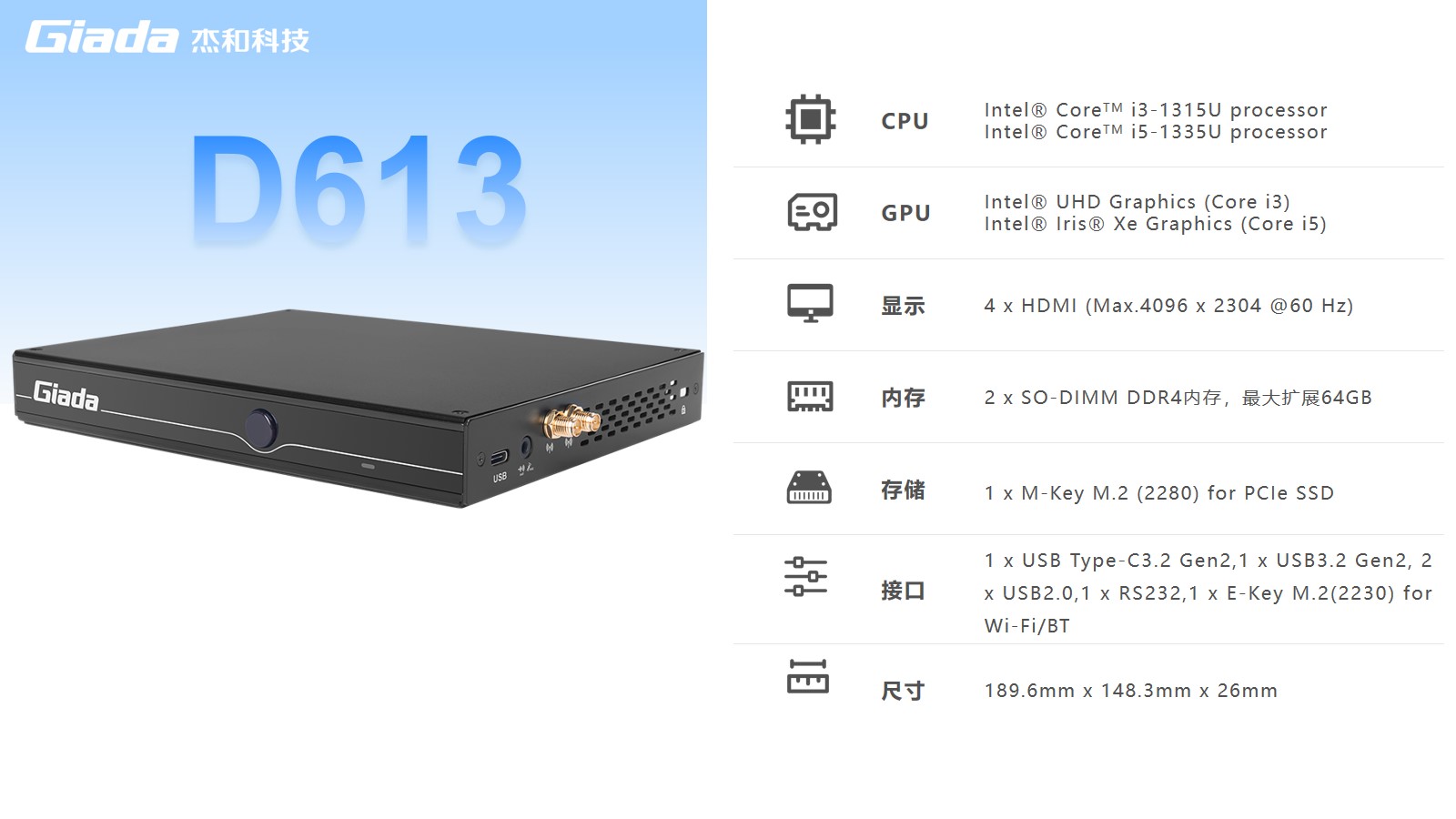 CA88(中国区)有限公司数字标牌D613搭载Intel RaptorLake Corei3-1315U/i5-1335U处理器,可以同时连接4个4K显示器,支持4K分辨率编码解码,还支持5G蜂窝网络,速度比4G LTE快10倍。