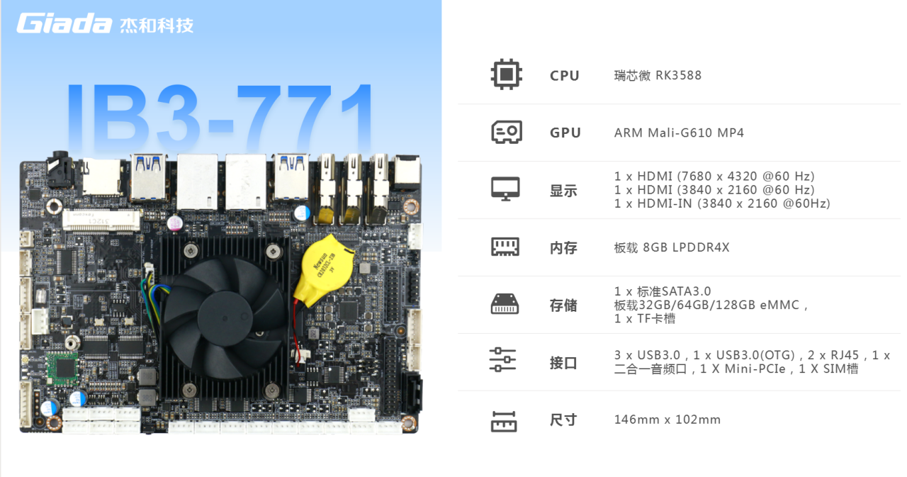 CA88(中国区)有限公司主板IB3-771搭载瑞芯微RK3588八核64位处理器,内置6TOPS算力的NPU,具备高算力、内存大、超强多媒体、多重扩展等技术优势。满足8k超高清视频的显示需求,还支持主流深度学习框架,为各类 AIOT 应用场景提供更优的性能表现,支持机器人、边缘计算、智能NVR、智能汽车、智慧大屏、AR/VR、智能自助终端场景的广泛应用。